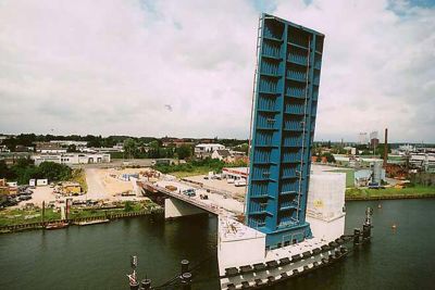 La solution d’un tablier mobile en acier semblait la seule option logique. L’acier a aussi été choisi pour la partie fixe du pont. Les tabliers des deux éléments du pont ont été réalisés au moyen de tôles orthotropes en acier S355 et recouverts d’époxy résistant à l’usure. Les poutres principales de la partie fixe sont des profilés en I, alors que celles de la partie mobile sont soudées en caissons. La partie mobile est équipée de deux triangles debout. L’angle supérieur de chaque triangle est relié à un câble. Le tablier du pont est levé et rabaissé lorsque ces câbles sont enroulés ou déroulés.</p>