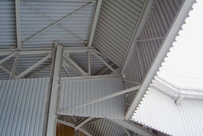 La toiture est composée de panneaux sandwich autoportants, en tôle d’acier, à isolation thermique en laine de roche, et avec une tôle perforée en face inférieure, dans le but d’améliorer l’ambiance acoustique dans l’atelier.</p>