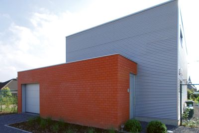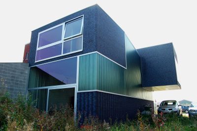 Tekst: <p>Le volume construit de cette nouvelle habitation, incluant un bureau d’architectes se distingue par sa puissance et la pureté de ses lignes. Ces caractères, il les doit à son ossature en acier et au revêtement du toit et des façades. Ce revêtement est principalement constitué de tuiles, mises en valeur par des panneaux. Un volume est ainsi créé dont émane une impression de simplicité monolithique. La technique de construction associe une ossature en acier et un remplissage en bois du squelette. <br>