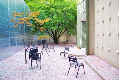 Le souci d’intégration au contexte a plaidé en faveur d’une structure minimale et légère. Quatre poteaux métalliques tubulaires de teinte jaune, rouge, bleu et vert supportent une membrane tendue translucide. Des tirants en inox assurent également la reprise des charges tandis que les blocs dans lesquels ils sont ancrés ont été aménagés en bancs.</p>