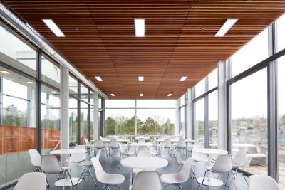 Tekst: <p>Dans le bâtiment central du campus Blairon, différents locaux communiquent les uns avec les autres par un espace d’accueil multifonctionnel dans lequel se trouve une passerelle à hauteur d’étage. Une bibliothèque à deux étages, un vide ouvert et une cage d’escalier se trouvent au-dessus. </p>