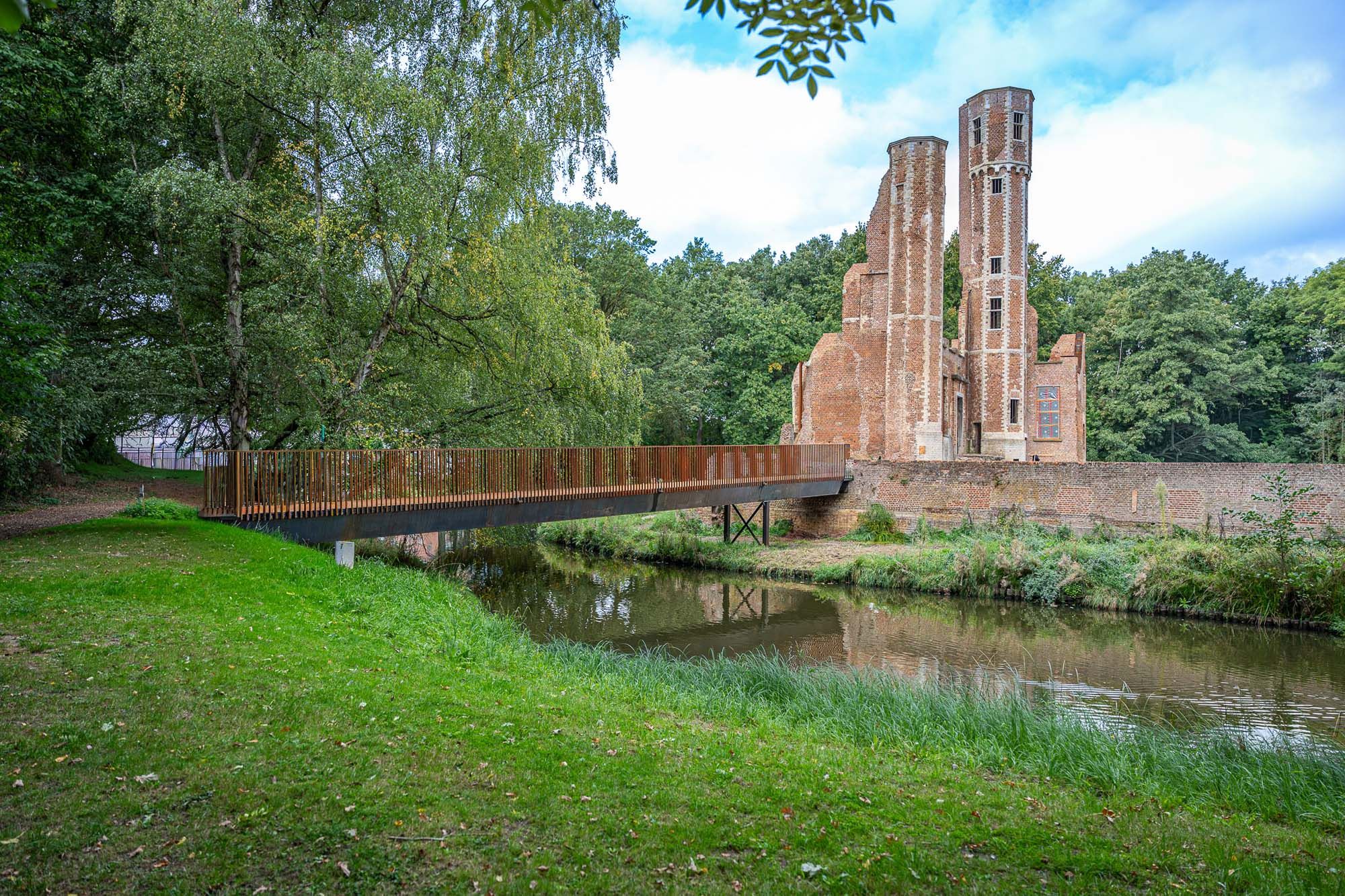 Weervaststalen voetbrug bij kasteelruïne